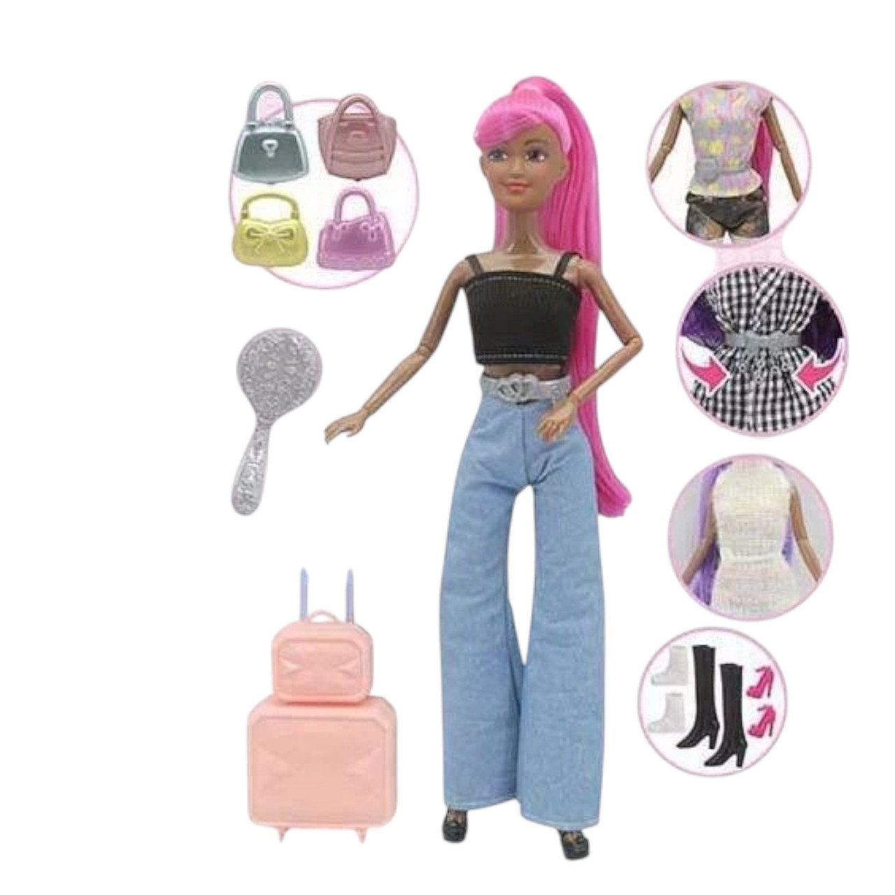 - у комплекті ви знайдете безліч аксесуарів, серед яких: гребінець, валіза, змінний одяг, кілька пар взуття та сумочка;
