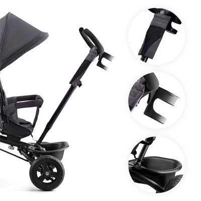 У комплекті також передбачений знімний та регульований капюшон , який захистить малюка від сонячних променів та вітру, забезпечуючи комфорт у будь-яку погоду. Дві кошики для речей – зручне місце для зберігання іграшок, пляшечок або інших необхідних речей під час прогулянок, а підсклянник та сумочка на ручці додають додаткову функціональність та зручність.